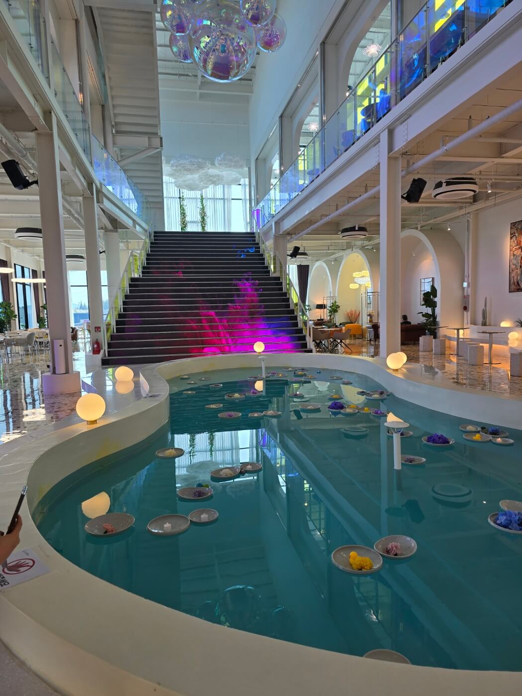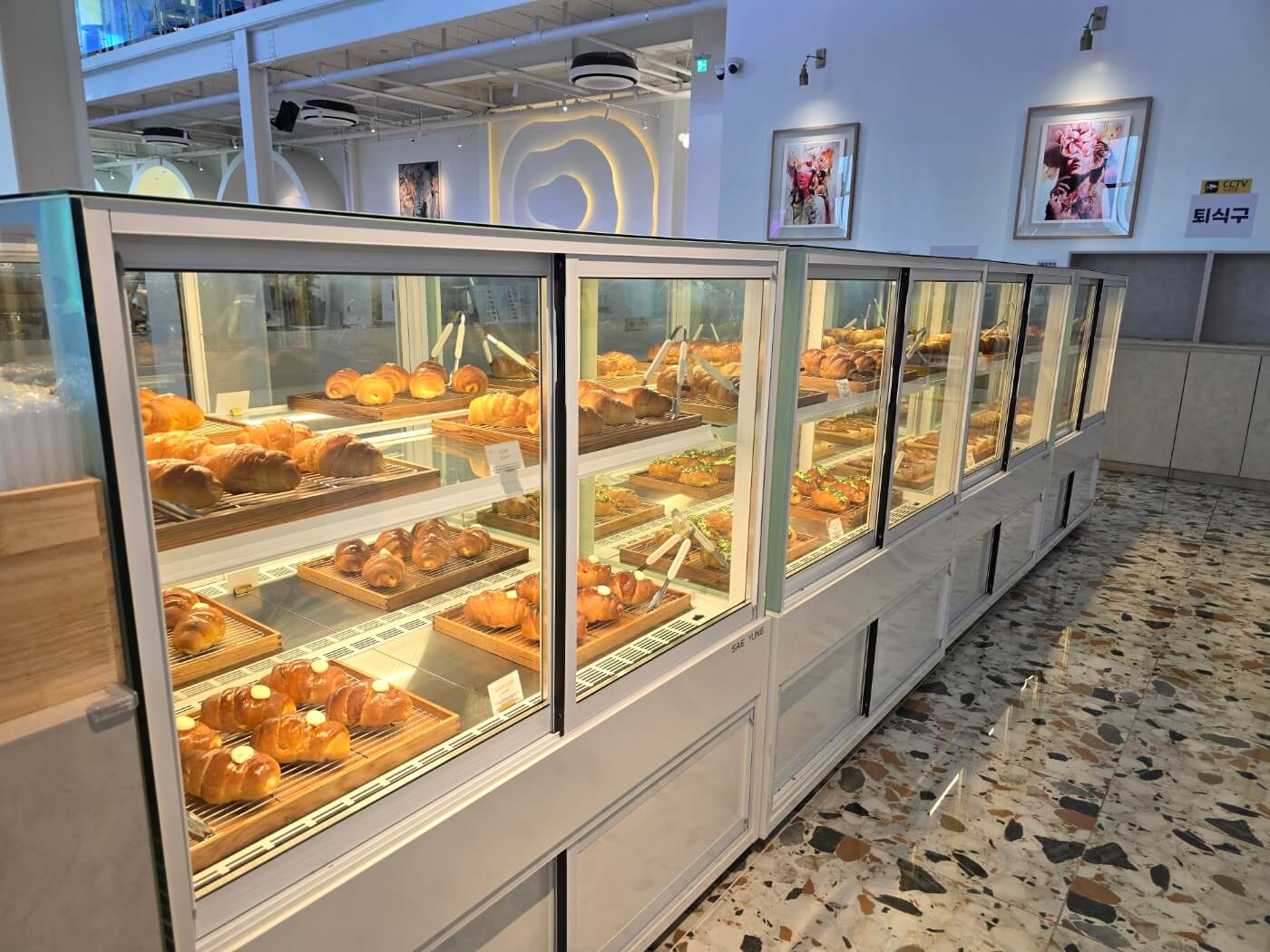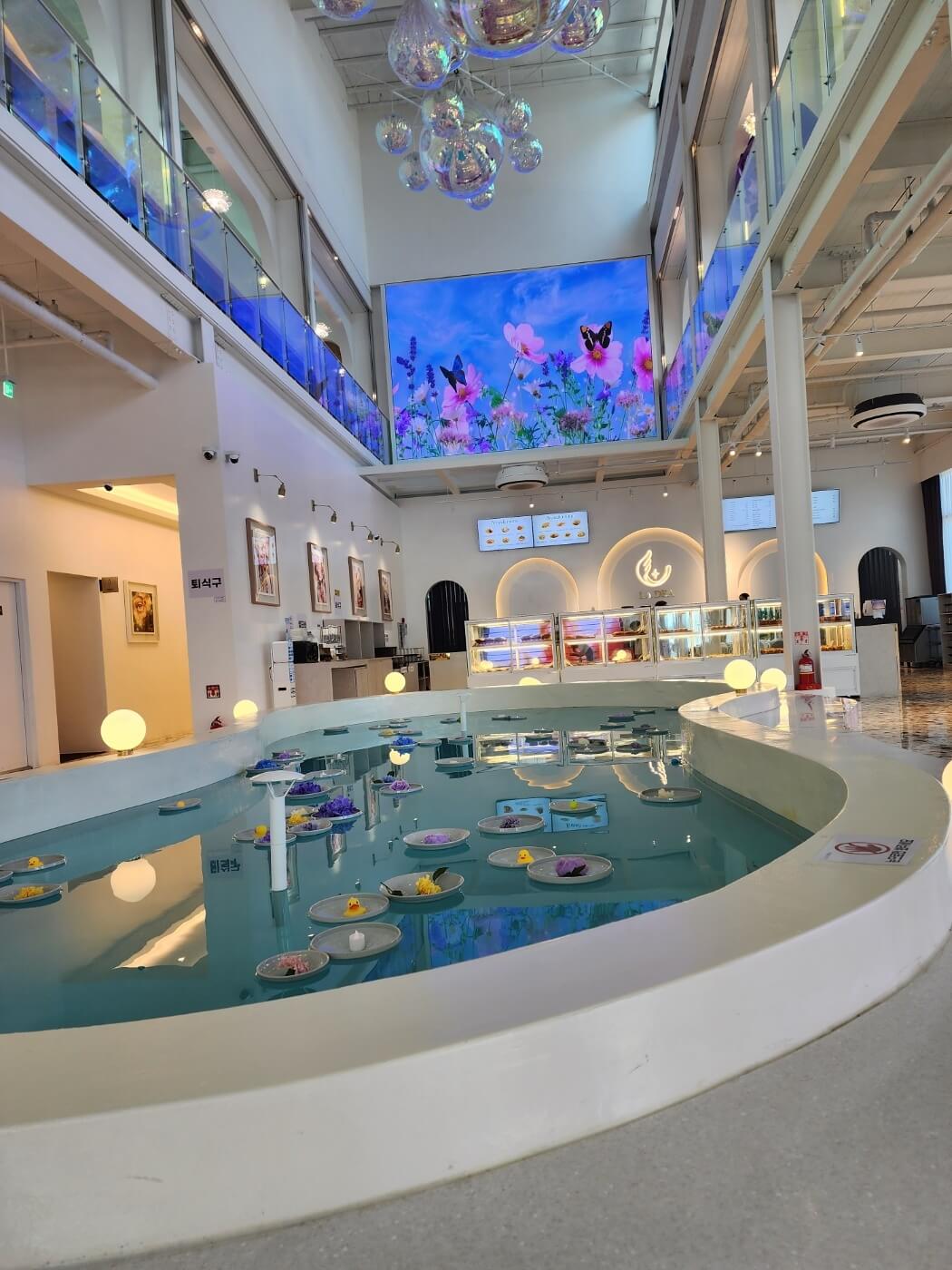 라데아 정문으로 들어오면 이렇게 커다란 연못이 눈앞에 놓여있습니다. 오른쪽은 베이커리 쇼케이스와 카운터가 좋여있고, 왼쪽으로는 테이블과 2층으로 올라가는 계단이 있습니다. 카운터 위쪽 스크린과 계단에는 미디어 아트가 계속 바뀌어가면서 나와서 계속 보고 있는 재미가 있었습니다.