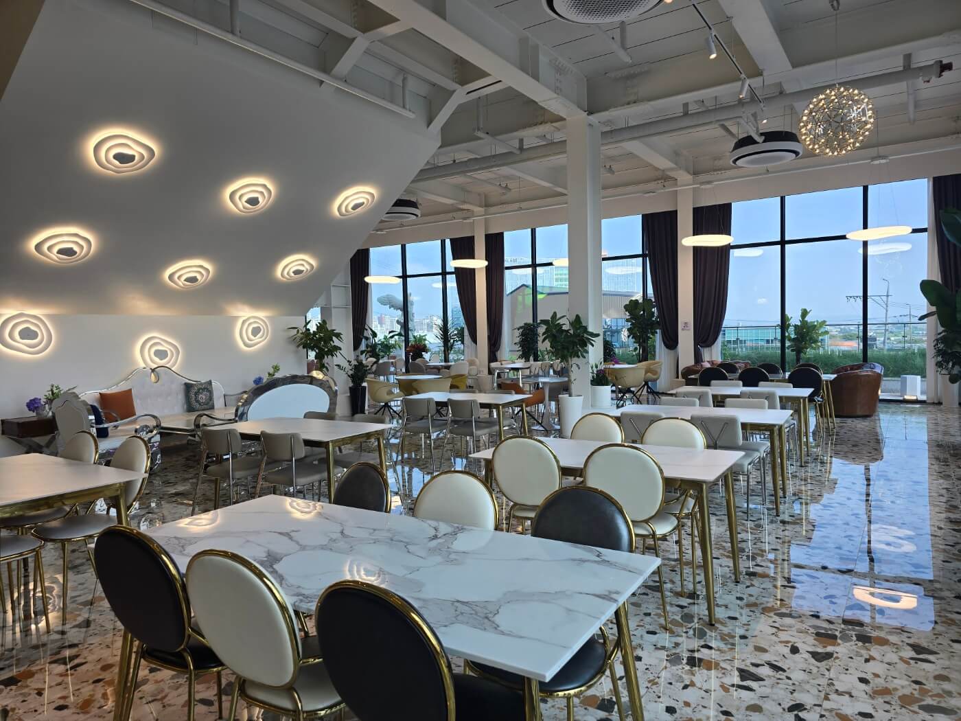 2층에 올라오면 또 많은 테이블이 놓여있었습니다. 라데아의 장점 중 하나가 경치라고 생각하는데요. 창가 자리에 앉으면 카페 앞으로 가리는 건물 없이 탁 트여있어 멀리까지 아주 잘 보여서 힐링하기 좋았습니다. 중간중간 날아가는 비행기가 어느 항공사인지 맞추는 재미도 쏠쏠했습니다.