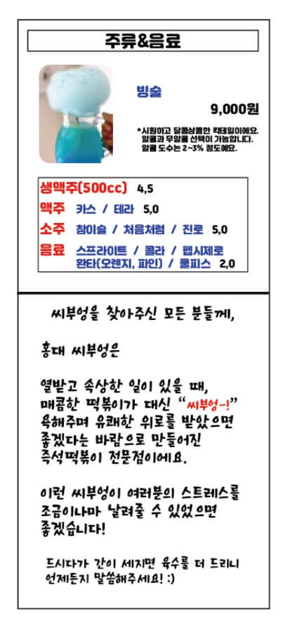 홍대에서 약속을 잡은 김에 매콤한 음식을 먹기로 했습니다. 사진부터 눈길을 끌던 매콤한 떡볶이 맛집 '홍대씨부엉'에 마음이 가서 다녀왔습니다. 오늘은 '홍대씨부엉'을 다녀온 후기를 적어보려 합니다.