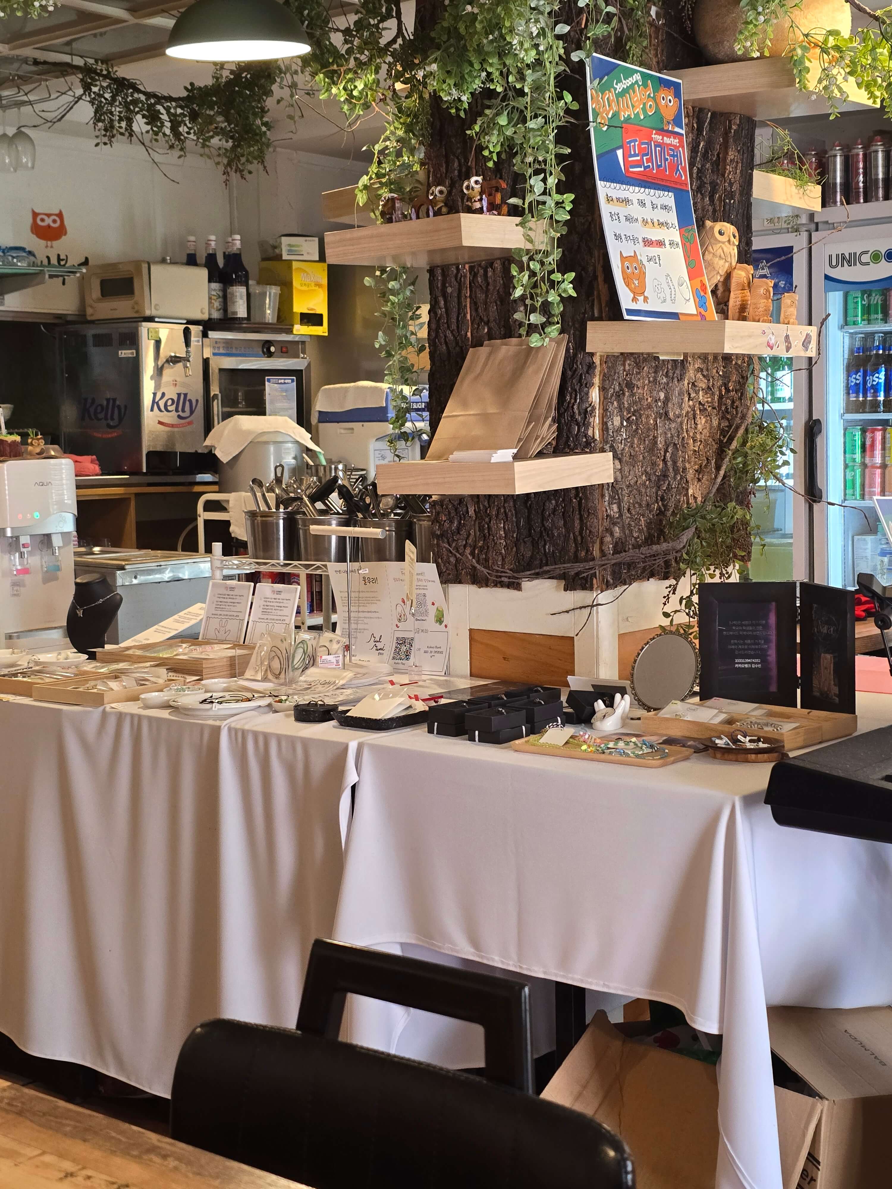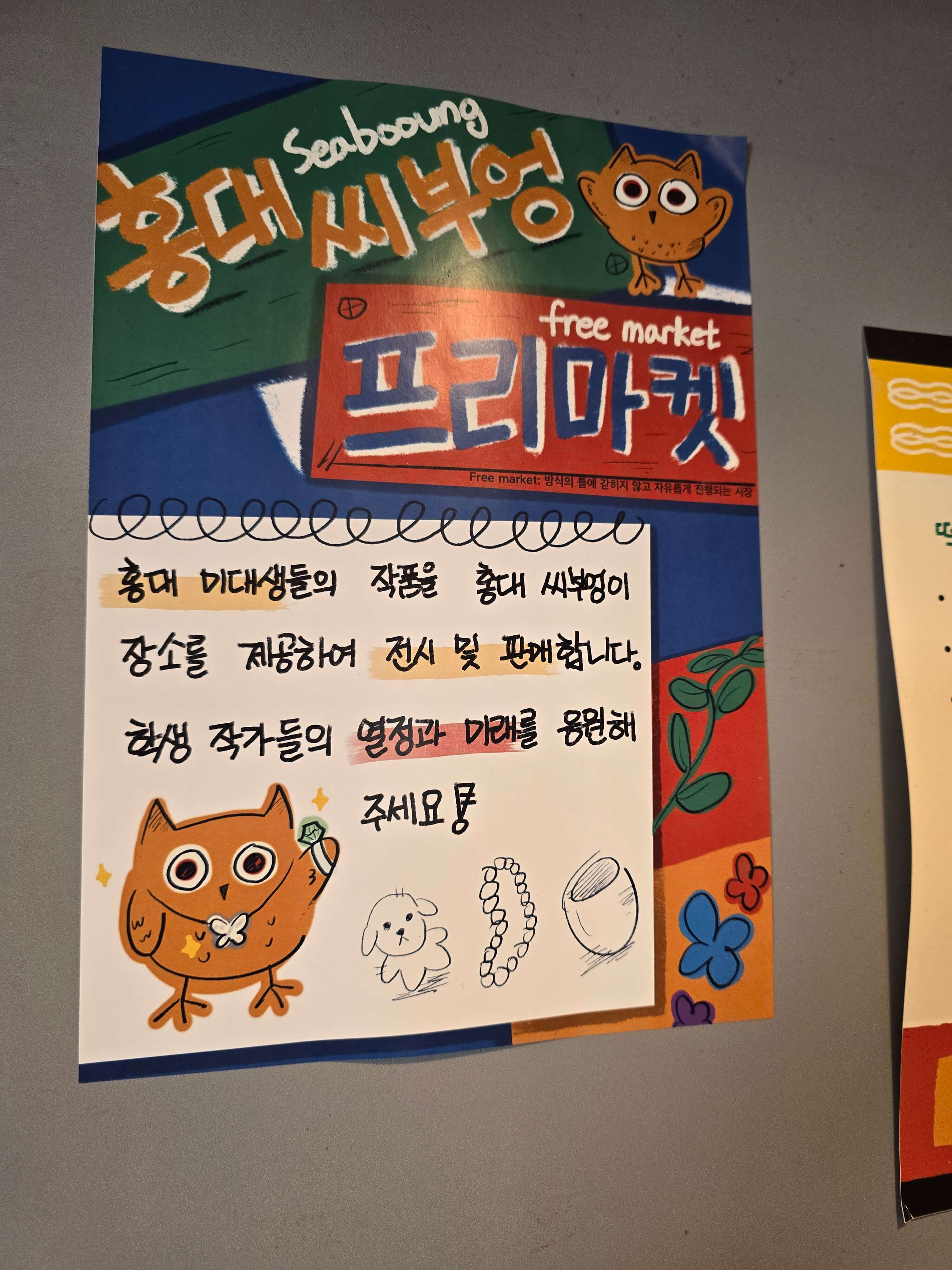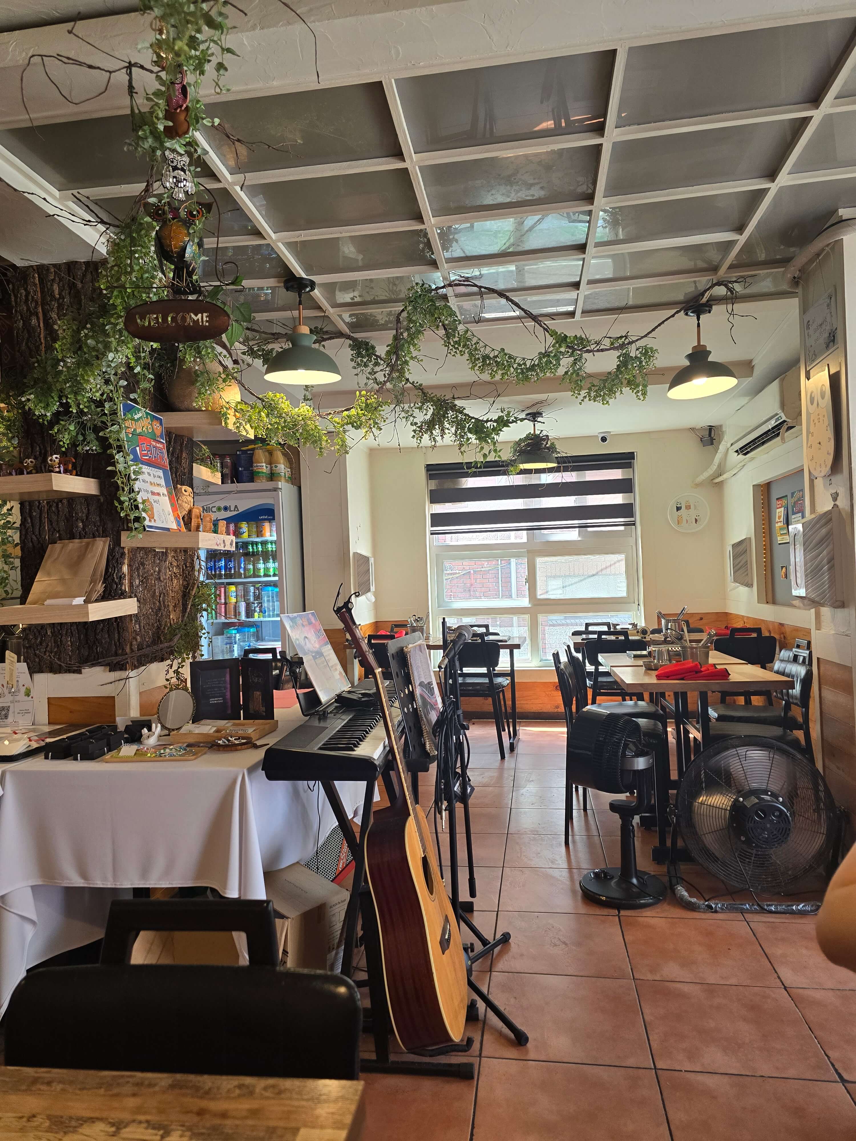 음식을 기다리는 동안 매장 한가운데에 진열되어 있는 액세서리를 구경했습니다. 진열되어 있는 제품들은 프리마켓의 형식으로 홍대 미대생들의 작품을 홍대씨부엉에서 전시 및 판매를 하는 것이라고 합니다. 또한 한쪽에는 기타와 키보드, 마이크가 놓여있었는데 버스킹 장비를 무료로 대여하는 일도 하고 계신다고 합니다.