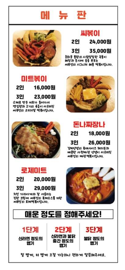 맵기는 3단계로 기본 신라면정도의 맵기부터 불닭정도의 맵기까지 있어서 원하는 맵기로 골라 먹을 수 있습니다.