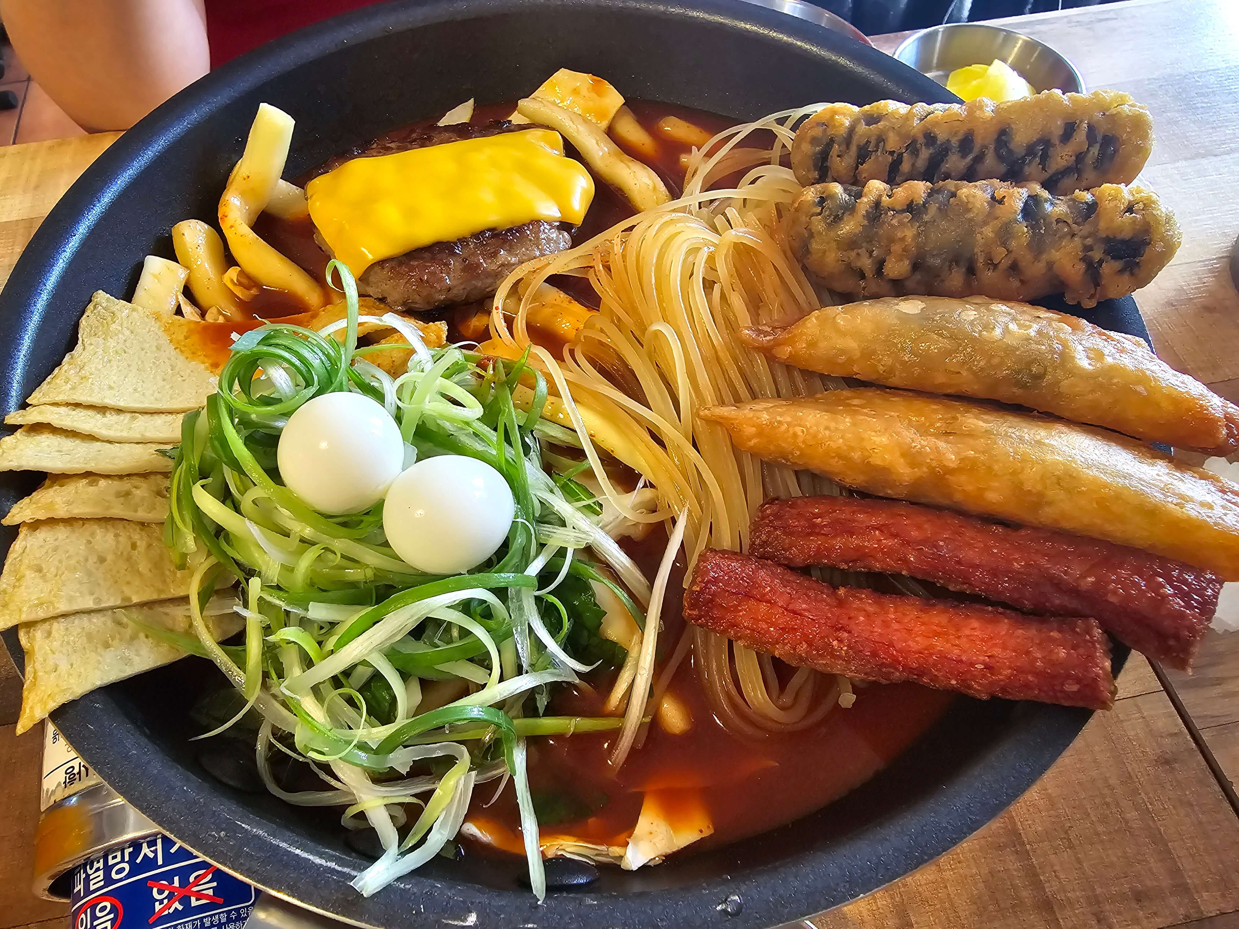 구경하며 시간을 보내는데 떡볶이가 나왔습니다. 설명으로는 튀김을 건져내고, 끓이면 된다고 합니다. 끓기 시작한지 3분 정도가 되면 먹으면 되는데, 함께 나온 패티의 속이 익지 않았을 수도 있으므로 확인하고 먹으라는 설명까지 해주셨습니다.